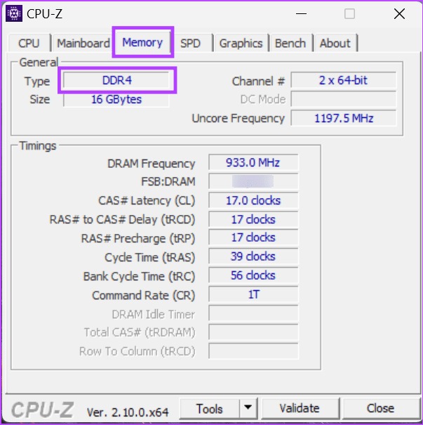 - به تب Memory بروید تا نوع RAM (مانند DDR4) و سایر جزئیات را بررسی کنید.