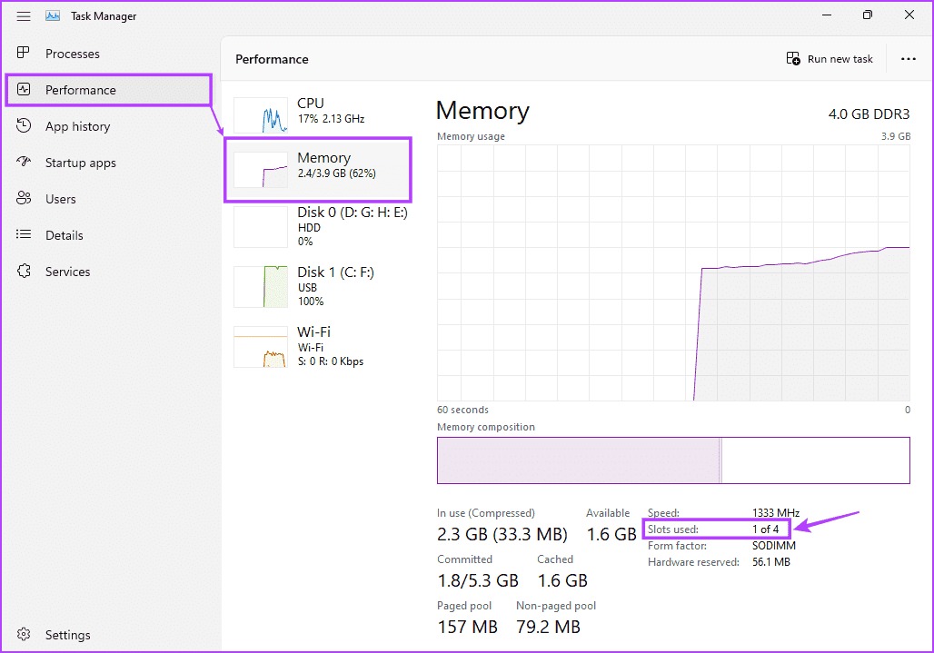 - بخش Slots used را بررسی کنید تا ببینید چند اسلات از چند اسلات کل، در حال استفاده هستند.