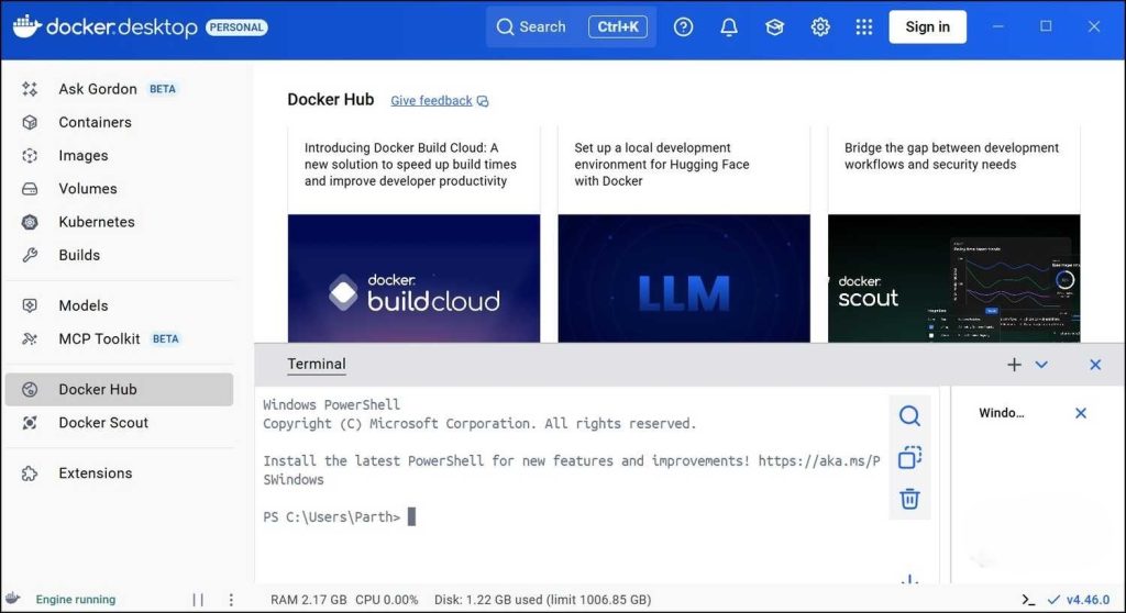 اگر قبلاً از داکر در مک یا لینوکس استفاده کرده‌اید، با اپلیکیشن ویندوزی احساس راحتی خواهید کرد. می‌توانید کانتینرها، ایمیج‌ها، ولوم‌ها، و builds را از نوار کناری پیدا کنید و از Docker Hub دسترسی داشته باشید. همچنین، گزینه‌ای برای راه‌اندازی ترمینال از پایین وجود دارد.