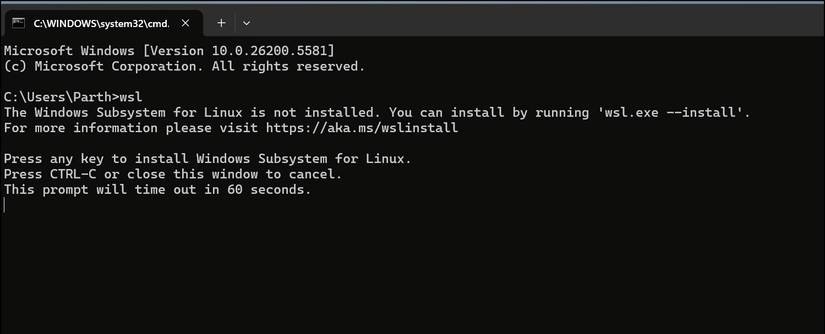 قبل از نصب داکر، مطمئن شوید که ماشین ویندوزی شما تمام نیازمندی‌ها را برآورده می‌کند. ابتدا باید نصب WSL را تأیید کنیم. کلیدهای Windows + R را فشار دهید، cmd را تایپ کنید و Enter را بزنید. حالا WSL را تایپ کنید و Enter را بزنید تا ببینید آیا نصب شده است. اگر WSL نصب نشده باشد، WSL --install را تایپ کنید و Enter را بزنید. فرآیند نصب باید به‌طور خودکار شروع شود.