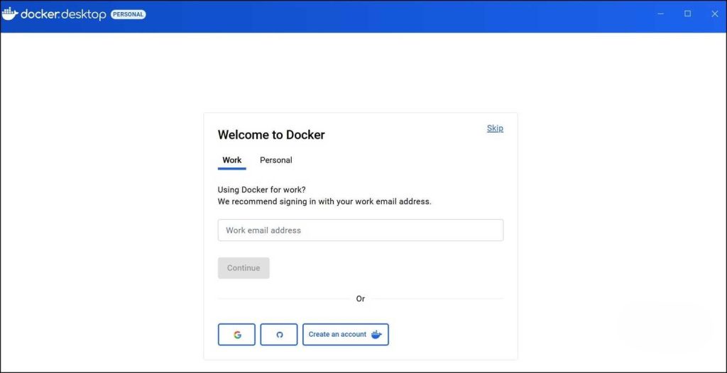 داکر اپلیکیشن‌های بومی برای ویندوز، مک، و لینوکس ارائه می‌دهد. برای ویندوز، می‌توانید آن را از وب‌سایت رسمی یا از Microsoft Store دانلود و نصب کنید. پس از تکمیل دانلود، Docker را اجرا کنید و مراحل راه‌اندازی را دنبال کنید. از شما ID کاری یا شخصی می‌خواهد، اما می‌توانید آن را رد کنید و مستقیماً به صفحه اصلی بروید.