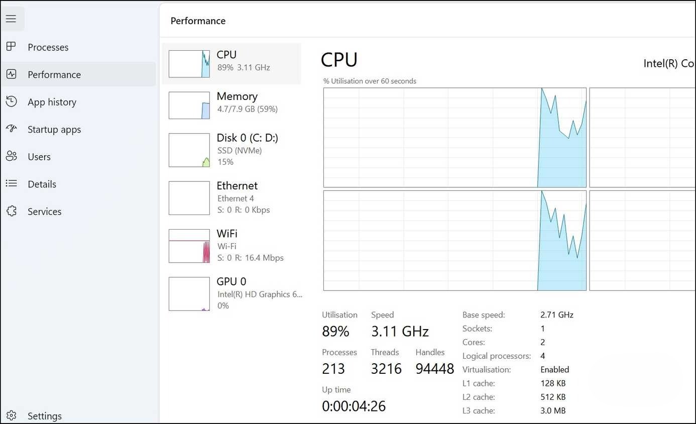 در نهایت، مهم است که تأیید کنید مجازی‌سازی سخت‌افزاری روی PC شما فعال است. برای تأیید، به Task Manager > Performance > CPU بروید. اگر فعال نیست، باید از منوی BIOS دستگاه آن را روشن کنید.