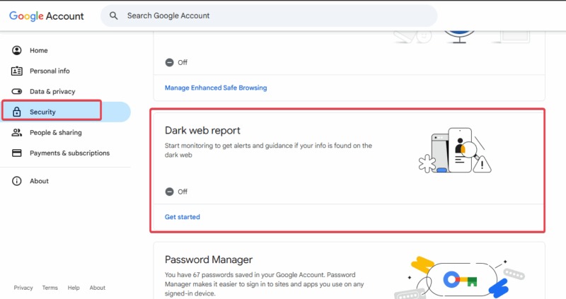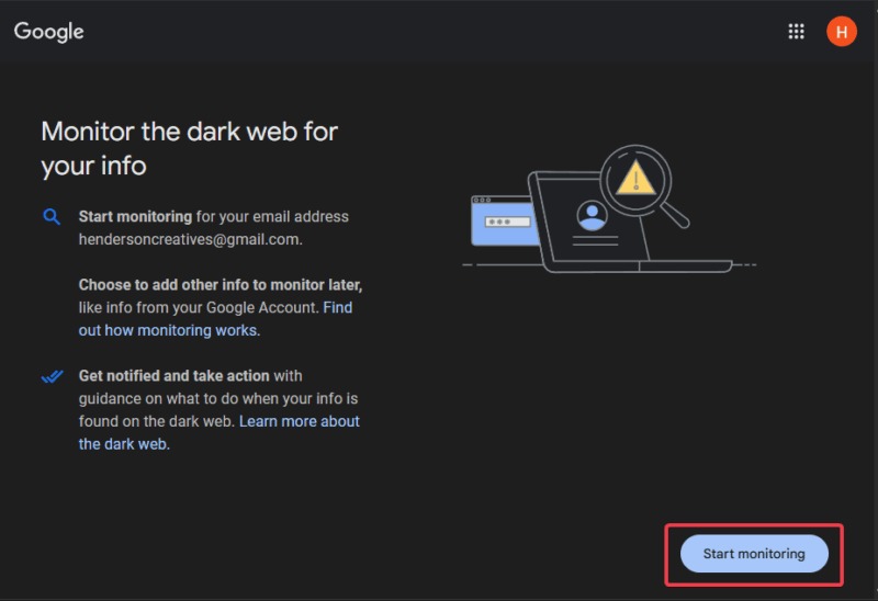 اسکن دارک وب گوگل، که به‌طور رسمی Dark Web Report نامیده می‌شود، یک ویژگی داخلی رایگان در Gmail است که دارک وب را برای اطلاعات نشت‌کرده مانند ایمیل‌ها، رمزهای عبور، شماره‌های تأمین اجتماعی، یا آدرس‌ها اسکن می‌کند. شما یک پروفایل نظارت ایجاد می‌کنید و آن به شما هشدار می‌دهد. اساساً، این یک نگهبان برای سرقت هویت است.