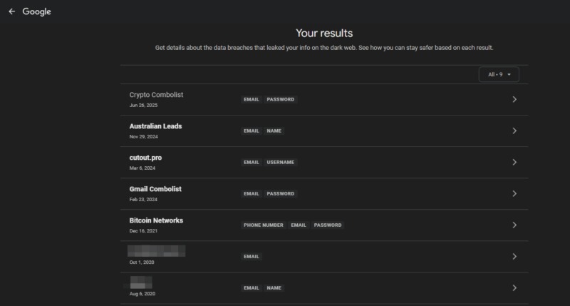 پس از فعال شدن، گوگل پایگاه‌های داده شناخته‌شده نفوذ و منابع دارک وب را اسکن می‌کند و به شما هشدار می‌دهد. نتایج بر اساس نوع فیلتر می‌شوند و پیشنهادهایی برای اقدام بعدی ارائه می‌دهند.