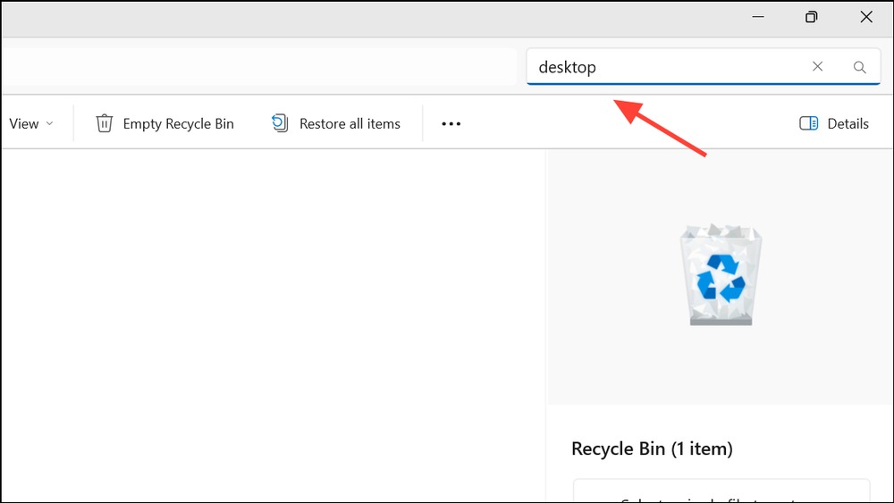 مرحله ۲: از نوار جستجو در پنجره Recycle Bin برای جستجوی “Desktop” استفاده کنید یا فهرست را برای یافتن پوشه Desktop حذفشده بررسی کنید.