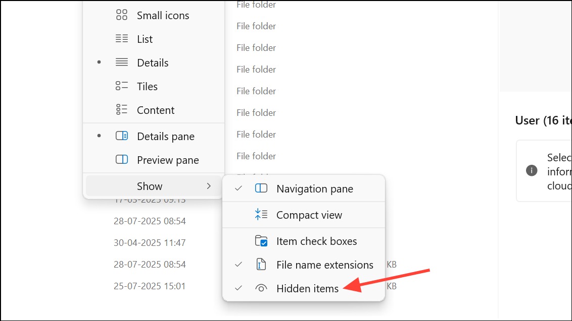 مرحله ۲: به C:\Users\[Your Username] بروید. اگر پوشه Desktop قابل مشاهده نیست، روی تب View کلیک کنید و کادر Hidden items را علامت بزنید تا پوشههای مخفی نمایش داده شوند.