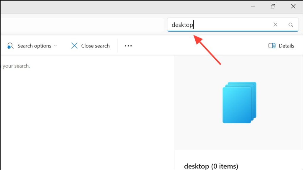 مرحله ۳: از نوار جستجو در File Explorer یا منوی Start برای جستجوی “Desktop” استفاده کنید تا ببینید آیا پوشه به مکان دیگری منتقل شده است.