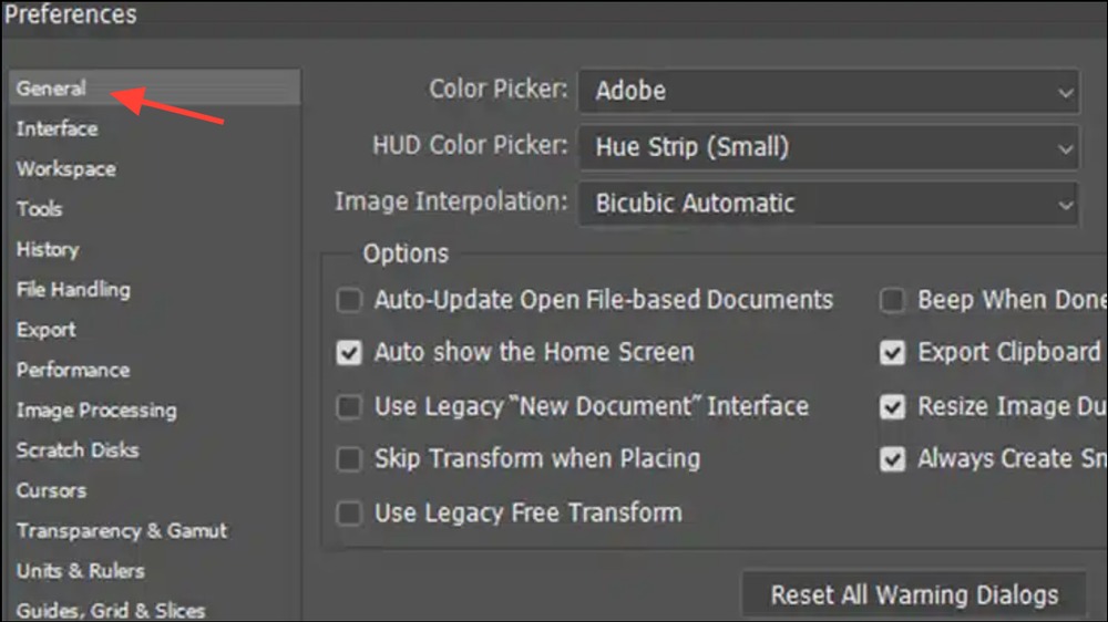 تنظیمات خراب یا نادرست میتوانند ویژگیهای GPU را مسدود کنند. در Photoshop، به Edit > Preferences > General (ویندوز) یا Photoshop > Preferences > General (macOS) بروید، سپس روی Reset Preferences On Quit کلیک کنید. Photoshop را ببندید و دوباره باز کنید تا بازنشانی اعمال شود.
