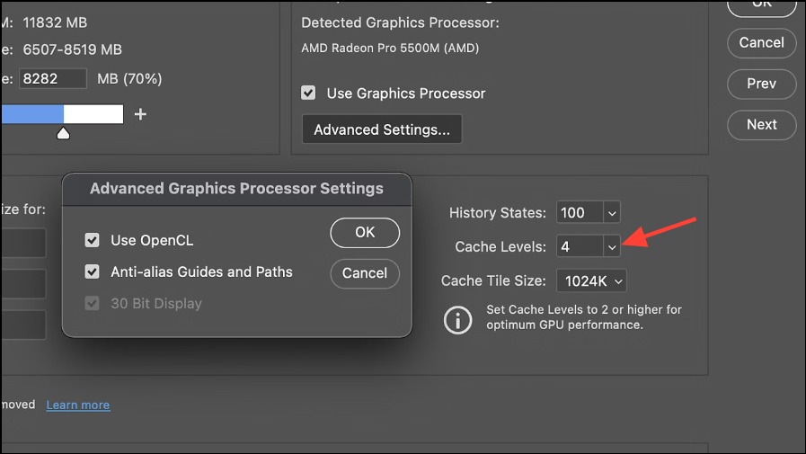 سطوح کش را در Edit/Photoshop > Preferences > Performance بررسی کنید. Cache Levels را روی ۴ تنظیم کنید، که مقدار پیشفرض و بهینه برای عملیات GPU است. پس از تغییر این تنظیم، فتوشاپ را ریستارت کنید.