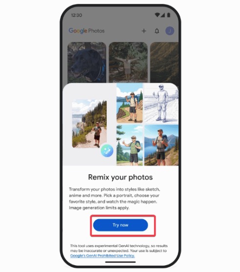 لذت واقعی در ویژگی Remix است، زیرا میتوانید عکسها را به سبکهای انیمه، کمیک، اسکچ یا انیمیشنهای سهبعدی تبدیل کنید. روی دکمه + کلیک کنید، Remix را انتخاب کنید و روی Try now بزنید.