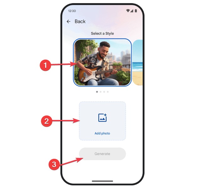 عکسی از یک شخص یا حیوان خانگی انتخاب کنید، سبکی را از گزینهها انتخاب کنید، روی Generate کلیک کنید و چند لحظه صبر کنید.