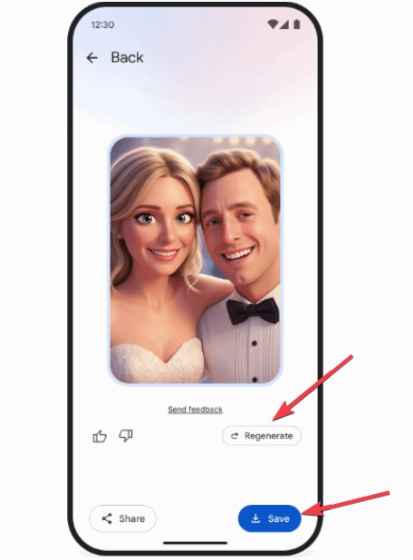این اپلیکیشن که توسط Veo 2 گوگل پشتیبانی میشود، حدود یک دقیقه طول میکشد تا یک کلیپ ۶ ثانیهای تولید کند. اگر نتیجه را دوست دارید، آن را ذخیره کنید و اگر نه، روی Regenerate کلیک کنید تا دوباره امتحان کنید.