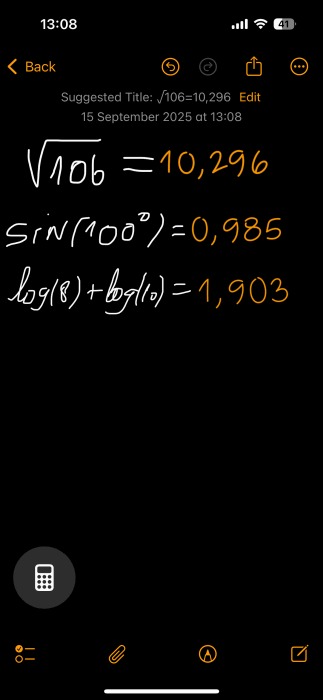 میتوانید Math Notes را وادار به حل معادلات ساده کنید، مانند یافتن ریشه مربعی ۱۰۶. علاوه بر این، ابزار اپل قادر به مدیریت توابع مثلثاتی، لگاریتمی، و نمایی پایه و عملیاتهای اساسی حسابان است.