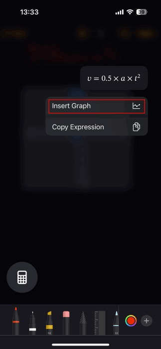 علاوه بر این، برنامه میتواند نمودارها را مستقیماً از عبارات شما تولید کند. وقتی معادلهای با متغیرها در هر دو طرف علامت مساوی وارد میکنید، پنل پاپآپی با گزینه Insert Graph ظاهر میشود.