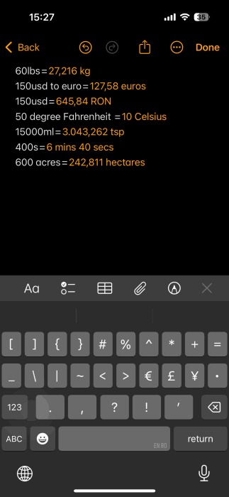 Math Notes اپل از تبدیلها نیز پشتیبانی میکند. چیزی مانند این را بنویسید: ۶۰lbs= تبدیل فوراً انجام میشود.