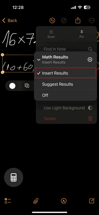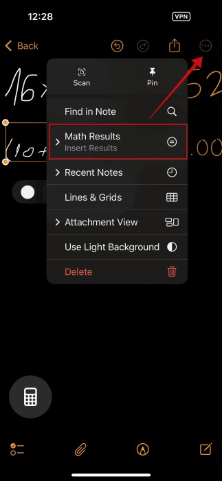 اگر پس از کشیدن یا تایپ، نتیجه را نمیبینید، روی سه نقطه در گوشه بالا سمت راست ضربه بزنید و Math Results را انتخاب کنید.
