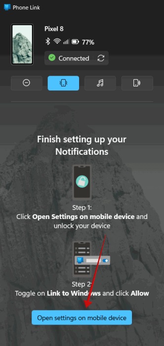 - فعالسازی اعلانها:پس از اتصال، در برنامه ویندوز روی گزینه Open settings on mobile device در سمت چپ کلیک کنید. پیامی روی گوشی ظاهر میشود؛ آن را لمس کرده و در تنظیمات گوشی، اجازه دسترسی به اعلانها را به برنامه Link to Windows بدهید.