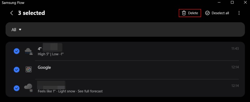 در این برنامه با راستکلیک روی هر اعلان و انتخاب گزینه Delete، اعلان از هر دو دستگاه پاک میشود.
