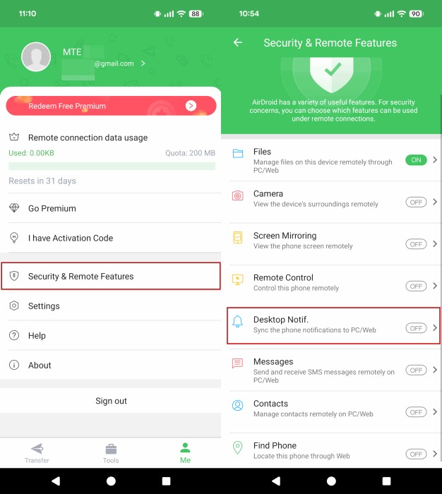 ۲. در اپلیکیشن گوشی، به بخش Security & Remote Features بروید و گزینه Desktop Notif را روشن کنید.