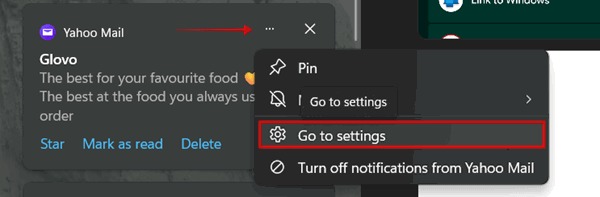 اگر میخواهید دیگر اعلانها را در Phone Link نبینید، روی سه نقطه روی هر کارت اعلان کلیک کنید و گزینه Go to settings را انتخاب کنید.