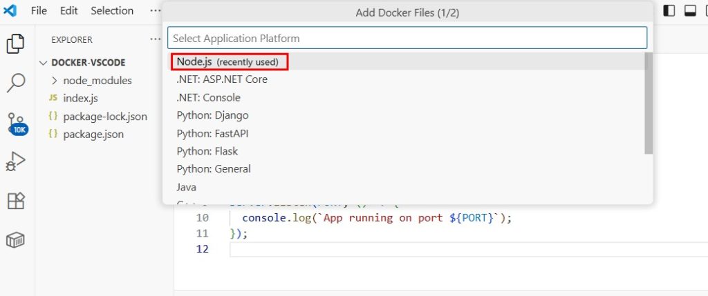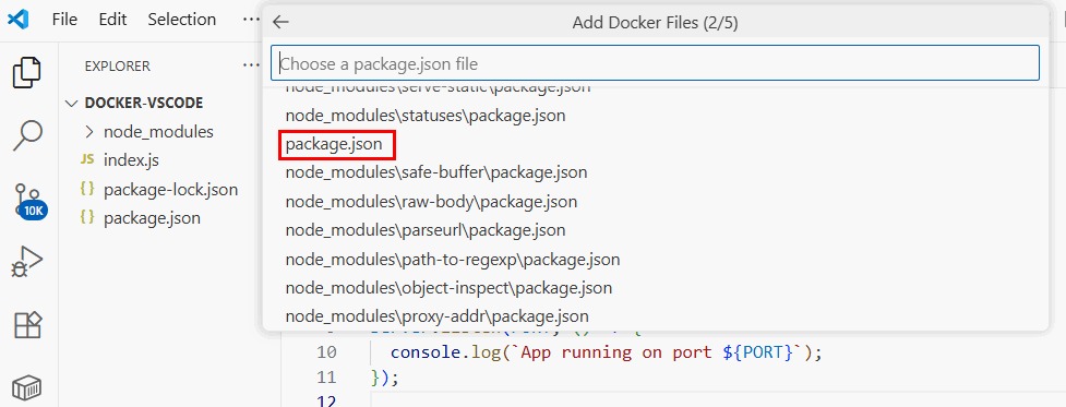 فایل package.json را در ریشه پروژه (همان پوشه index.js) انتخاب کنید. این فایل پیکربندی اصلی اپلیکیشن شماست و افزونه داکر از آن برای تولید فایل‌های لازم استفاده می‌کند.