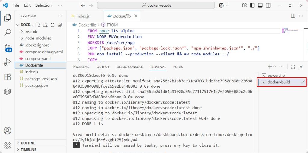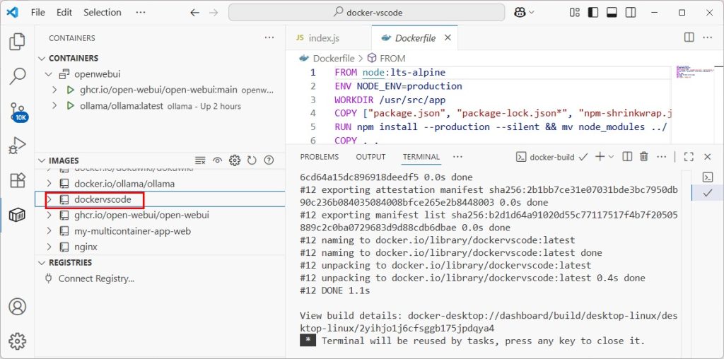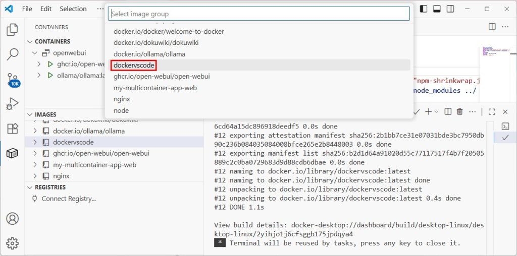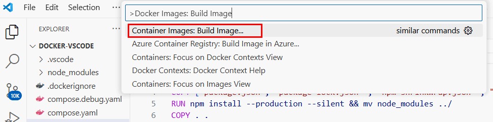 برای ساخت ایمیج داکر، روی Dockerfile راست‌کلیک کنید و Build Image را انتخاب کنید یا در پالت دستورات، Docker Images: Build Image را اجرا کنید.