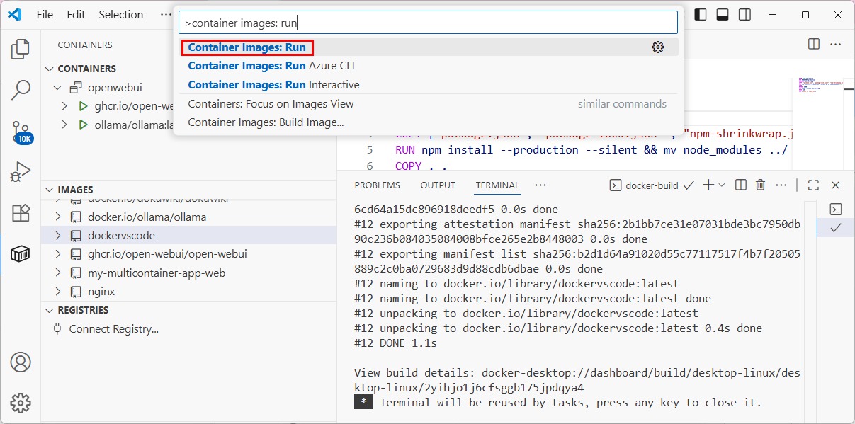 پالت دستورات را باز کنید، دستور Container Images: Run را اجرا کنید یا روی ایمیج خود راست‌کلیک کرده و Run را انتخاب کنید.