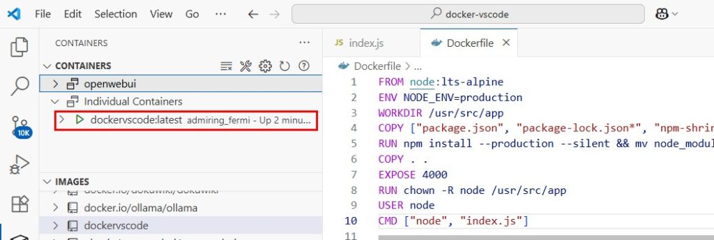 برای تأیید اجرا، بخش Containers در Docker Explorer را بررسی کنید.