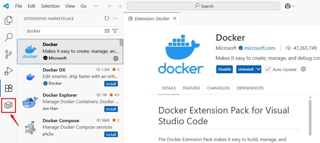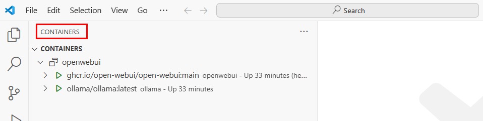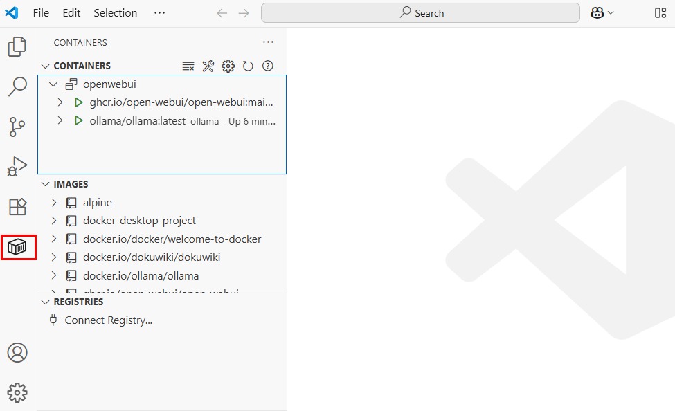 پس از تکمیل نصب، آیکون Docker/Containers در گوشه پایین سمت چپ ویرایشگر ظاهر می‌شود که به‌عنوان Docker Explorer عمل می‌کند.