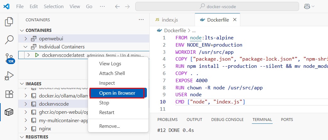 برای مشاهده اپلیکیشن در حال اجرا، روی کانتینر در حال اجرا در Docker Explorer راست‌کلیک کنید و Open in Browser را انتخاب کنید.