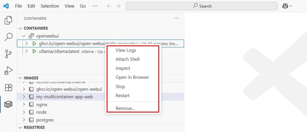 پس از ادغام صحیح داکر، می‌توانید اکثر وظایف مرتبط با کانتینرها را مستقیماً از VS Code مدیریت کنید.