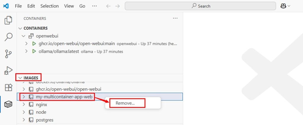مدیریت ایمیج‌ها: می‌توانید ایمیج‌ها را کش (pull) کنید، ایمیج‌های جدید بسازید، یا ایمیج‌های استفاده‌نشده را حذف کنید. برای مثال، برای حذف یک ایمیج استفاده‌نشده، روی آن راست‌کلیک کنید و Remove را انتخاب کنید.