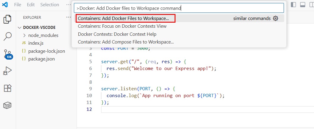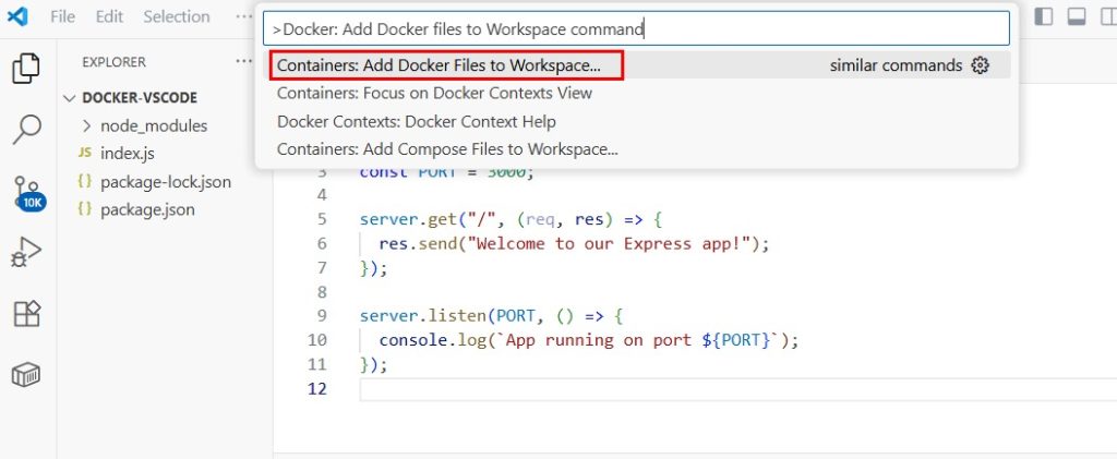 پالت دستورات (Command Palette) را باز کنید (⇧⌘P در مک یا Ctrl+Shift+P در ویندوز) و دستور Add Docker files to Workspace را تایپ کنید.