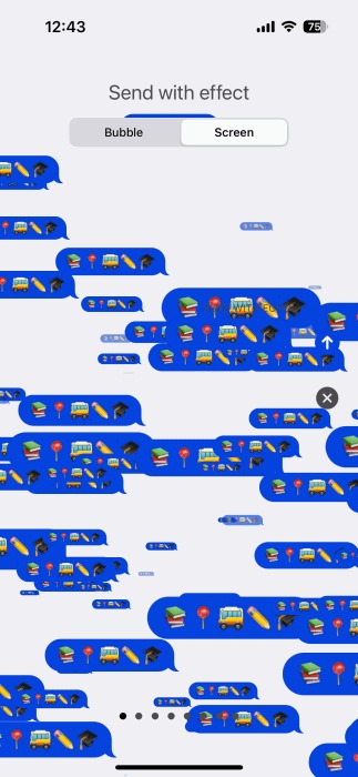 میتوانید ایموجیها و استیکرها را به پیام خود اضافه کنید، درست مانند افکتهای ساده. برای ارسال متن با افکت انتخابشده، روی فلش آبی کوچک ضربه بزنید. افکت فقط یکبار هنگام مشاهده اولیه پیام توسط گیرنده پخش میشود، اما گیرنده میتواند با ضربه زدن روی دکمه Replay زیر پیام، آن را دوباره پخش کند.