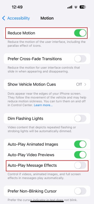 - گزینه Reduce Motion را در بالا فعال کنید.