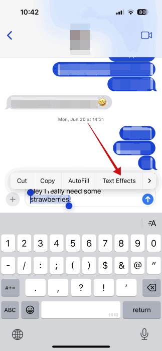 متن خود را تایپ کنید و روی دکمه افکتها (A) که در نوار پیشنهادات زیر کیبورد ظاهر میشود، ضربه بزنید. یا، روی یک کلمه یا کل پیام دو بار ضربه بزنید تا انتخاب شود، سپس گزینه Text Effects را پیدا کنید (ممکن است لازم باشد برای دیدن این گزینه به سمت راست بکشید).