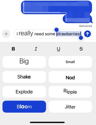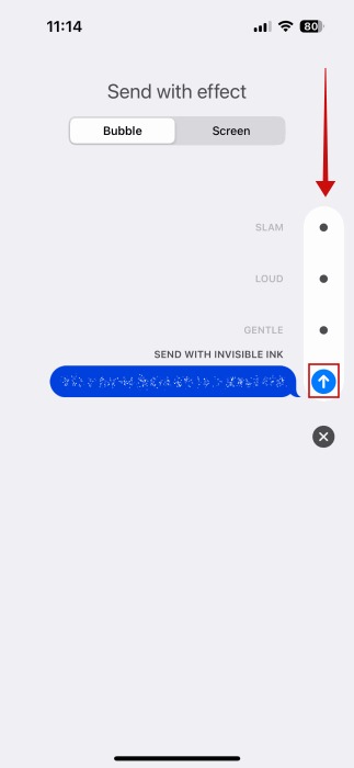 نوار افکتها در سمت راست ظاهر میشود. افکت مورد نظر خود را انتخاب کنید؛ برای مثال، Invisible Ink متن را با تار کردن مخفی میکند تا گیرنده روی آن ضربه بزند. افکت را انتخاب کنید و سپس روی فلش آبی کوچک ضربه بزنید تا پیام سفارشیشده در چت ارسال شود.