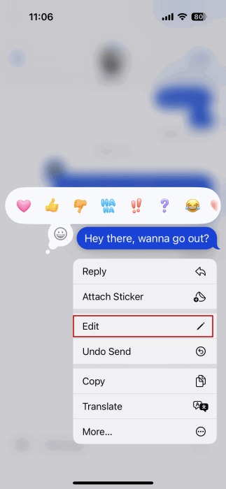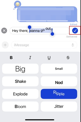 اگر پیام را قبلاً ارسال کردهاید، نگران نباشید؛ میتوانید بعداً انیمیشن را به پیامهای اخیر اضافه کنید. پیام را طولانی فشار دهید، گزینه Edit را از منوی کشویی انتخاب کنید، روی آیکون افکتها ضربه بزنید و انیمیشنها را اضافه کنید. سپس روی علامت تیک سمت راست ضربه بزنید تا پیام جدید ذخیره شود.