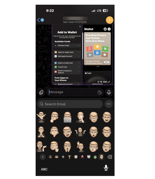 شما همچنین میتوانید از این استیکرها در برنامههای جانبی مثل واتساپ، تلگرام یا فیسبوک مسنجر نیز استفاده کنید. کافی است کیبورد ایموجی استاندارد iOS را باز کرده و به سمت چپ (بخش استیکرها) اسکرول کنید؛ مموجیهای شما در کنار سایر استیکرها آنجا منتظر شما هستند.