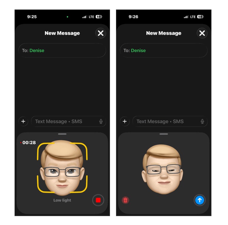 - در برنامه Messages: روی دکمه + بزنید، وارد بخش Memoji شوید، آواتار خود را انتخاب کرده و دکمه قرمز رنگ Record را بزنید. شما میتوانید تا ۳۰ ثانیه صحبت کنید یا شکلک دربیاورید و سپس آن را ارسال کنید.