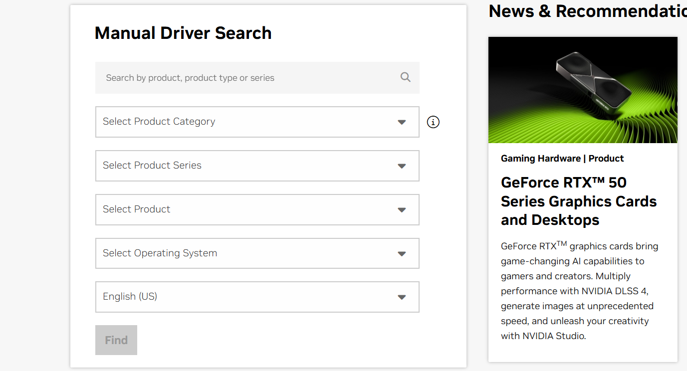 از آنجایی که قصد داریم نصب تمیز انجام دهیم، از گزینه خودکار استفاده نکنید؛ زیرا این گزینه صرفاً درایور فعلی شما را آپدیت میکند. بهجای آن، از بخش جستجوی دستی (Manual)، مدل کارت گرافیک خود را پیدا کرده و آخرین نسخه ارائه شده را دانلود کنید.