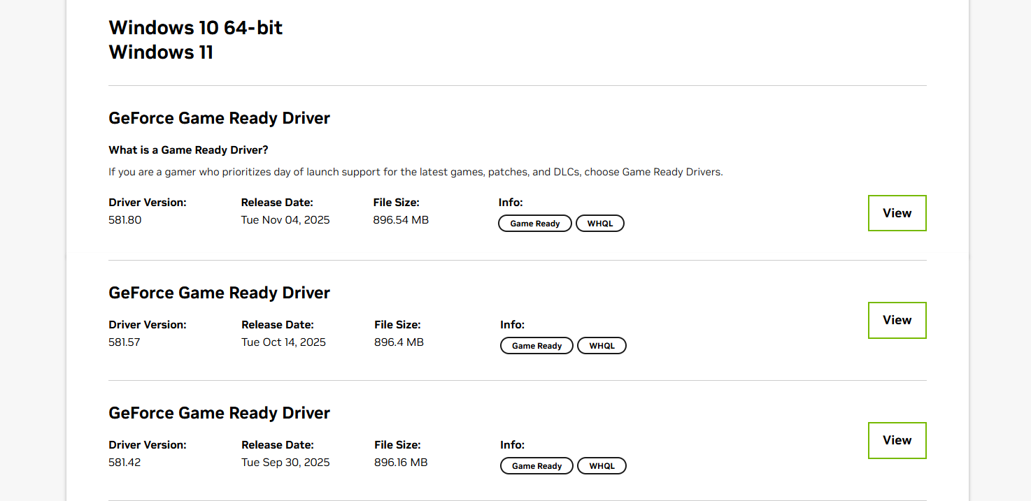 قبل از هر کاری، باید جدیدترین نسخه درایور متناسب با کارت گرافیک خود را از وبسایت رسمی NVIDIA دریافت کنید. هنگام مراجعه به سایت، با دو گزینه روبرو میشوید: