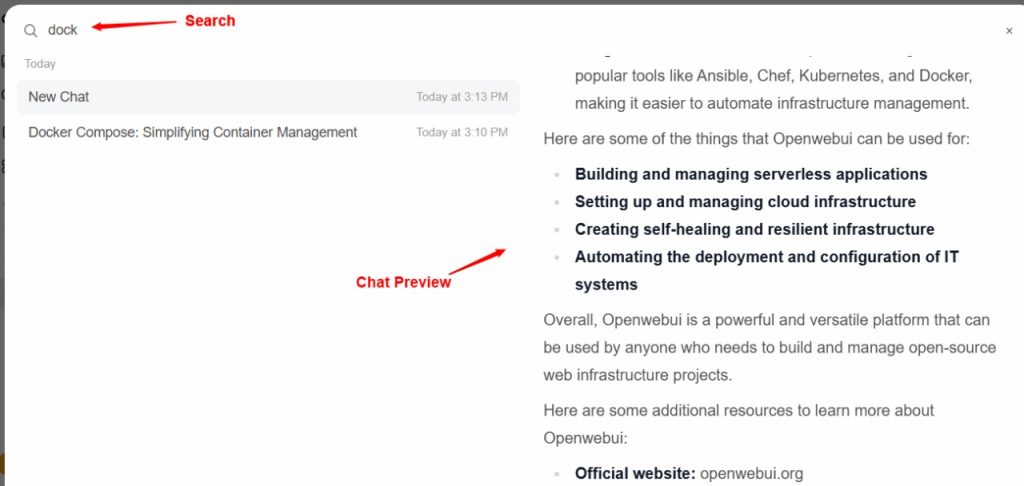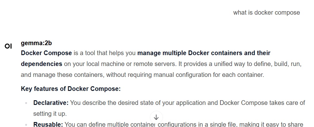 پس از انتخاب مدل، میتوانید شروع به پرسیدن سؤالات کنید. برای مثال، من پرسیدم “Docker Compose چیست؟” و Open WebUI پاسخ زیر را ارائه داد:
