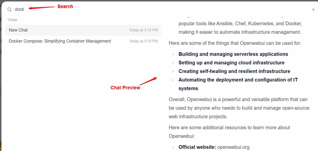 بخش Search به شما امکان میدهد گفتوگوهای گذشته یا کلمات کلیدی خاص را در چتهای ذخیرهشده پیدا کنید. برای این منظور، میتوانید یک کلمه یا عبارت را تایپ کنید و نتایج را فیلتر کنید تا بهسرعت پاسخها یا دستورات قدیمی را بازبینی کنید.