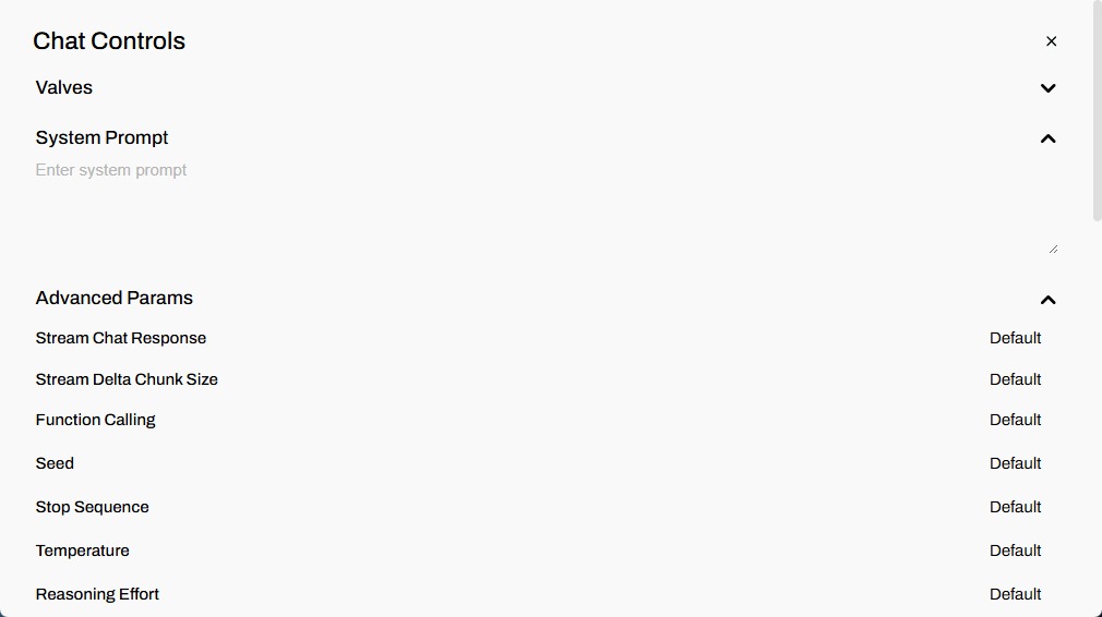 پنل Chat Controls به شما امکان میدهد نحوه پاسخدهی هوش مصنوعی در گفتوگو را تنظیم کنید. میتوانید یک System Prompt تنظیم کنید تا لحن یا رفتار را هدایت کند و پارامترهای پیشرفته مانند پاسخهای چت استریمینگ، اندازه قطعه، فراخوانی تابع، seed، توالی توقف، دما و تلاش استدلال را دقیق تنظیم کنید. هر پارامتر میتواند سفارشی شود یا برای رفتار استاندارد در حالت پیشفرض باقی بماند.