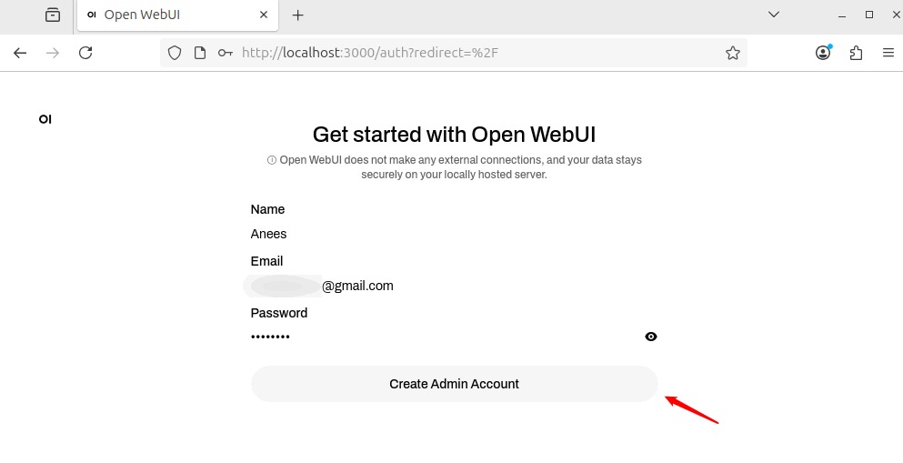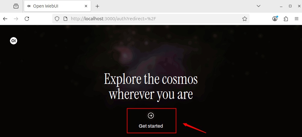 پس از شروع کانتینرها، یک مرورگر وب باز کنید و به آدرس http://localhost:3000 بروید. رابط کاربری Open WebUI از ماشین محلی شما بارگذاری میشود. روی دکمه Get Started کلیک کنید تا با تنظیمات Open WebUI ادامه دهید.