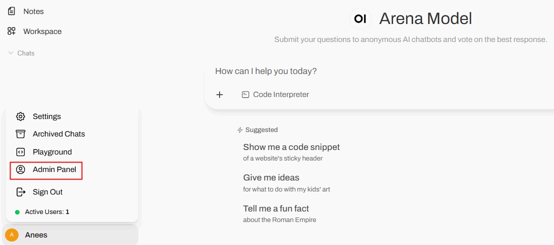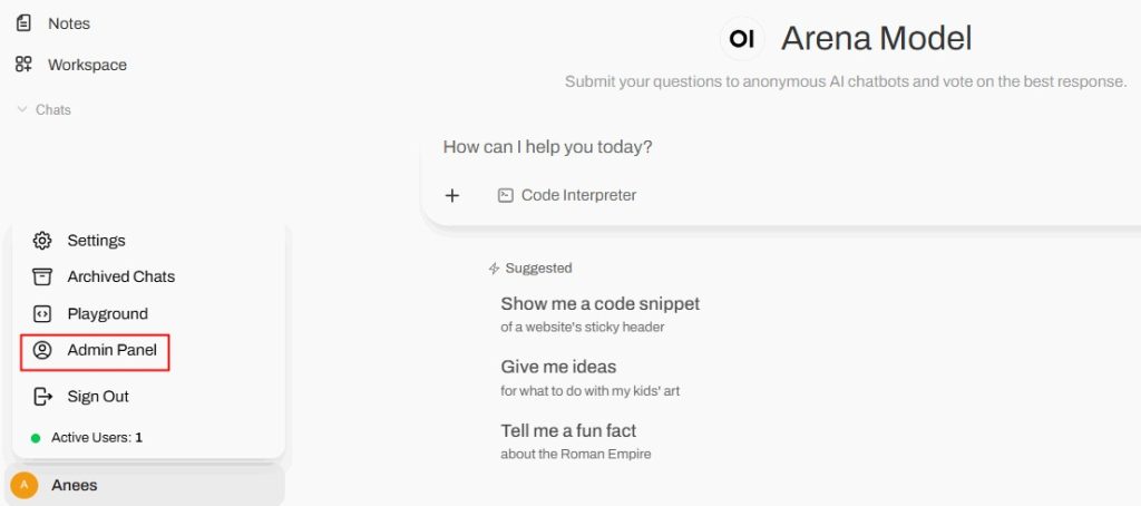 در این مثال، ما مدل gemma:2b را نصب میکنیم زیرا نسبت به مدلهای بزرگتر منابع کمتری مصرف میکند. برای این کار، روی آیکون پروفایل خود کلیک کنید و گزینه Admin Panel را انتخاب کنید تا به داشبورد مدیریتی دسترسی پیدا کنید.