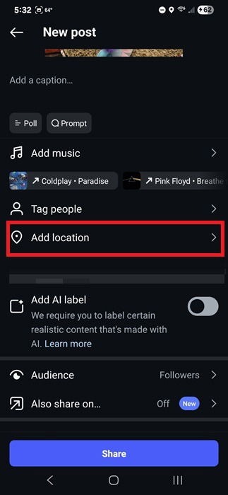 هنگام پست کردن محتوا، مکان شما بهطور خودکار برچسبگذاری میشود. یا میتوانید مکان را روی پستهای جداگانه تغییر دهید. هنگام ایجاد پست جدید، Add location را انتخاب کنید و مکان خود را انتخاب کنید.