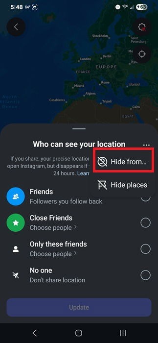 اگر فقط چند کاربر دارید که ترجیح میدهید مکان شما را نبینند، فقط آن را از آنها پنهان کنید. نقشه را باز کنید، روی Settings ضربه بزنید، روی سه نقطه در بالا سمت راست کادر اشتراکگذاری مکان ضربه بزنید و گزینه Hide from را انتخاب کنید.