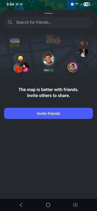 از پایین نقشه به بالا بکشید. اگر کسی مکان خود را اشتراکگذاری نکرده، روی Invite friends ضربه بزنید. اگر برخی دوستان در حال اشتراکگذاری هستند، روی آیکون Invite در پایین سمت راست ضربه بزنید. دوستی از فهرست خود انتخاب کنید و روی Request ضربه بزنید تا دعوت ارسال شود.